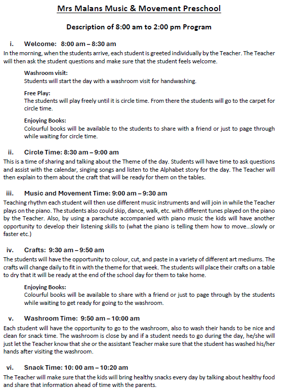 Mrs. Malan has a gentleness about her that transfers to her students. My daughter learned so much during the time that she was enrolled in the Music and Movement Preschool: how to interact appropriately with her peers, how to be respectful to others, how to sit and listen in an audience, how to take learning risks in a safe environment, and how to follow directions. My daughter would come home each day with well thought out, theme-based art and learning projects. She always enjoyed telling us about her day with Mrs. Malan and the other children. I highly recommend Mrs. Malan's Preschool program and am so pleased that my daughter was able to participate in it.